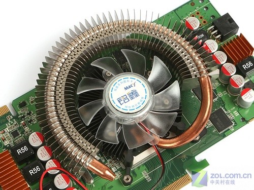铭鑫9600GSO同心版非常奢华的采用了酷冷至尊的“龙骨”热管散热器,它与公版的普通单槽铝制散热风扇相比,最主要的区别就是风扇的噪音更加小,而散热效率更高。而这种“龙骨”热管散热器,一般用于高档显卡,这也是它首次在800元以下的显卡上亮相。