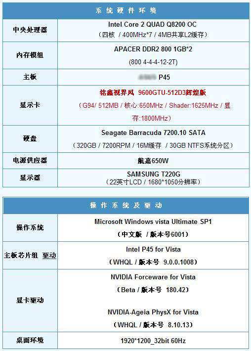 显卡性能测试使用的硬件平台由英特尔CORE 2 QUAD Q8200 CPU(OC)、P45主板和1GB*2双通道DDR2-800内存构成。细节及软件 环境设定见下表: