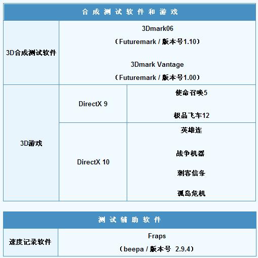 测试内容包括D3D合成测试软件3DMark 06和3Dmark Vantage,及2款最新DirectX 9 3D游戏和4款DirectX 10游戏。合成测试软件3DMark用总分衡量性能,3D游戏用平均fps来衡量性能,两者都是越高越好。
