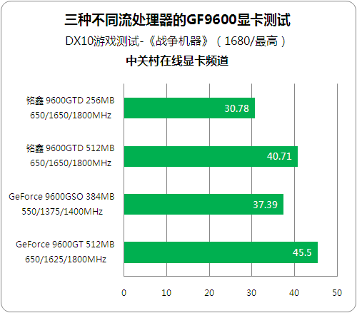 这也是一款DX10游戏测试,这里256MB的9600GTD落后一些,而512MB的9600GTD与老款Geforce 9600GSO 384MB相等,Geforce 9600GT性能最高。