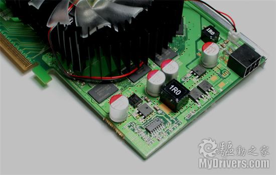 这两款显卡在外观上一模一样,采用的是完全相同的PCB走线和元器件布局。显卡的绿色PCB很有N卡风格,全固态电容和全封闭电感也使显卡在外观上比较养眼。显卡PCB板比较长,元器件用料上也没有明显的空缺,显得比较工整。2相显示核心供电电路位于显卡的前端,而另外的1相独立显存供电电路位于显卡的末端。显卡需要通过一个6针外接电源接口来获取正常工作所需的能量。
