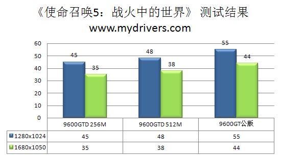 虽然仍然基于DX9 API,但是《使命召唤5》对显卡的却高了很多,高分辨率下9600GT公版卡也仅跑出了44fps的成绩。256MB显存导致的8%左右的性能损失使得256MB的显卡性价比优势不再存在。9600GT比9600GTD 512MB领先15% 左右,与二者之间的价格差距相比, 9600GTD 512MB显得比较有性价比。