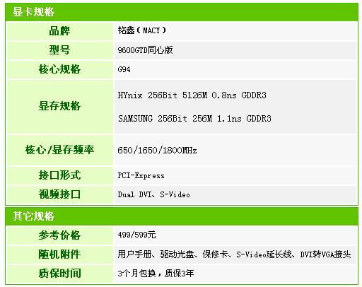 铭鑫9600GTD同心版目前有两个规格,主要是显存规格各不相同。256M版使用三星1.1ns颗粒,定价为499,而512M版使用HY 0.8ns颗粒,则定价549元。不过他们规格完全相同,出厂频率都为1800MHz,我们都知道,512M版使用的显存颗粒是目前最为旗舰的GTX260所使用,频率甚至能够达到2100MHz,而1800MHz的设置可谓是相当保守!