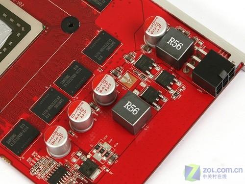 为了使显卡工作在更高的频率之上,还能保持低频率下的稳定性,铭鑫HD4850惊镭版在设计上强化了电路,配置了3+2五相供电电路,其中核心为3相,显存为2相,并且使用了多颗固态电容和封闭式电感。