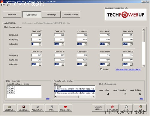 在我们使用电脑进行上网、办公以及看片的时候,并不需要显卡进行全负荷工作,因此我们的想法是,将先看到的N模式BIOS频率进一步降低,以达到更好的节能效果。玩大型游戏时,我们再切换到刚才修改的H模式BIOS,让显卡超频运行。