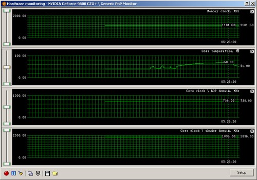 铭鑫的9800GTX+极速版搭配的超频三爱琴海热管散热器,让整个显卡的温度降低不少。通过RIVATuner的温度检测我们可以看到,其满载运行的最高温度可以控制在70度以下,空闲下甚至可以降低到不到40度。很好的温度控制,以及加强的供电设计,也让显卡还有一定的超频空间。