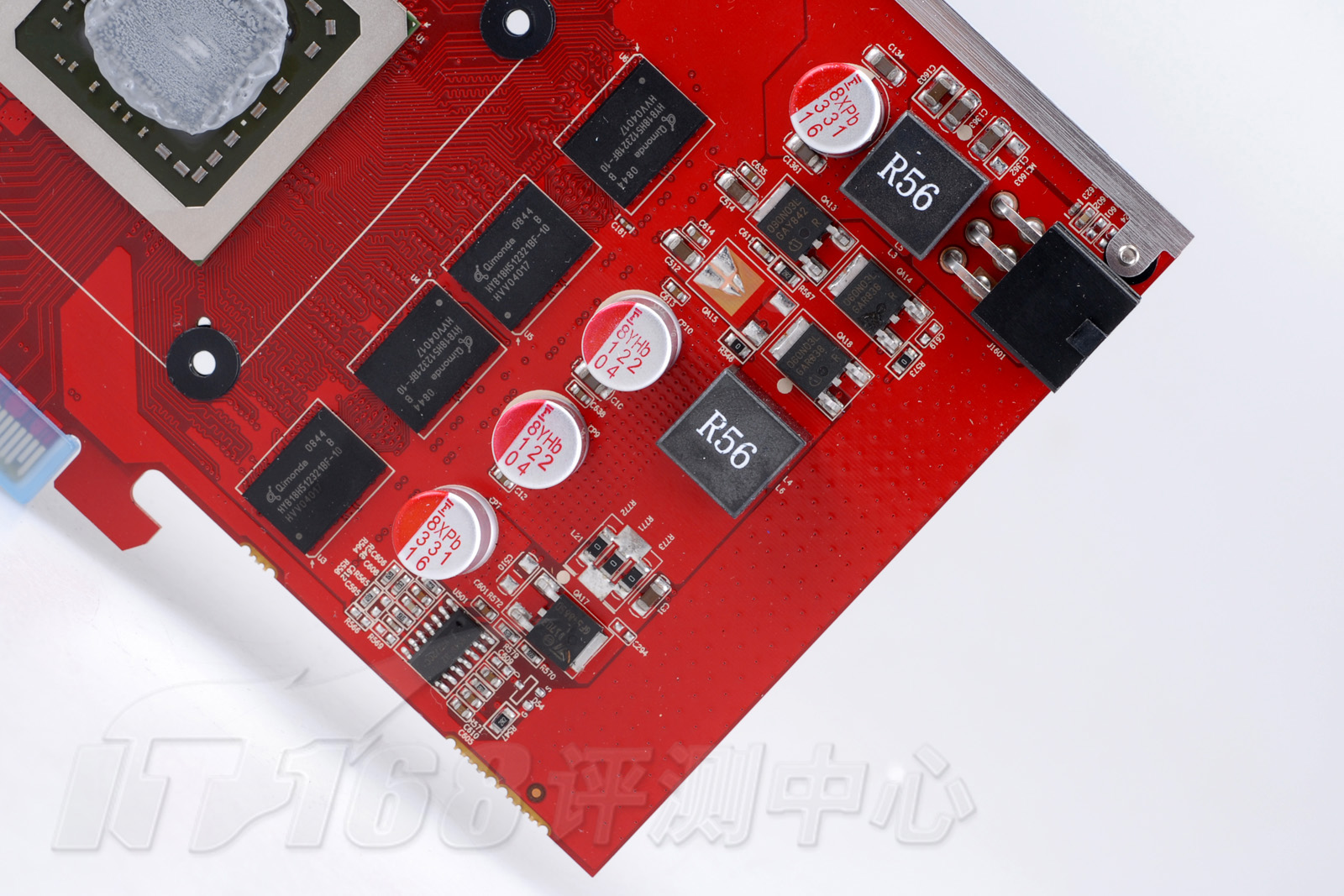 供电部分方面,核心与显存采用了分离式的设计,采用3+1相供电设计,3相为核心供电,1相为显存供电。选料上则采用富士通的固态电容,并采用全封闭电感设计。