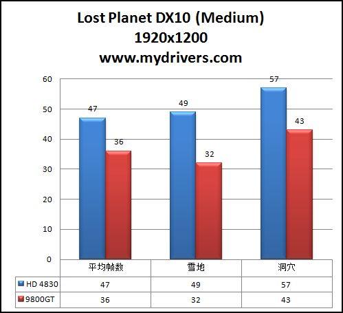 在Crysis这款游戏的测试中,HD 4830和9800GT这两款显卡的成绩基本相同,在1680x1050的分辨率下两者均突破的50帧,这样的成绩足以让用户流畅的感受到这款游戏的Medium画质。1920x1200这样大分辨率下两者的成绩仍是非常贴近,但从分数上来看,最终是HD 4830以微弱的优势胜出,如果综合双方的售价来看HD4830的性价比更高。