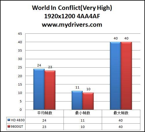 这个游戏中有不少的近距离激战场面,画面的细节渲染和结构对显存有一定要求,在测试中HD 4830的512M显存与9800GT的1GB显存相比有所不足,最终在两种分辨率的成绩上都负于对手。