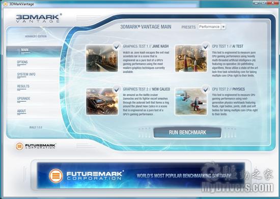 由于NVIDIA显卡的PhysX技术会令3DMARK VANTAGE 的CPU测试项目分数暴涨,所以在显示性能的对比上并没有太大的实际意义,所以分数只选择了总分和GPU得分来做对比。