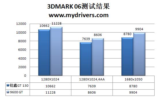 在DX9性能测试中,铭鑫GT 130依靠自身的高频率优势几乎与流处理器更多的9600 GT十分接近,1280X1024分辨率下还几乎平手,这也意味着在DX9游戏中,GT 130这款显卡的性能与9600 GT不会相差太远,都能提供较好的游戏速度。?