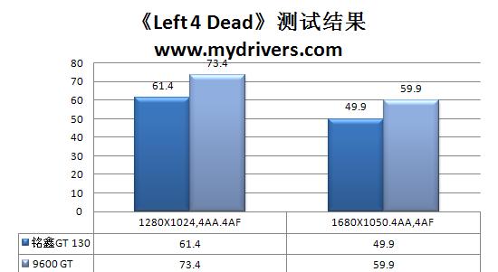 《Left 4 Dead》采用了改良版Source引擎,在拥有良好画质的同时并不需要太强的显卡资源即可流畅运行。铭鑫GT 130显卡虽然比9600 GT的帧数要低10帧左右,但是依然可以保证游戏需要,高画质设置下的1680X1050分辨率下平均帧仍保持在50帧以上。?