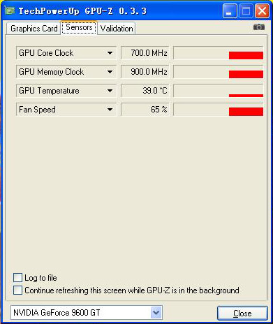 先来看看默认频率下待机的温度,此时风扇转速显示为65%,转速未知(由于风扇采用2针设计,所以无法调速也无法侦测转速)。此时待机状态下GPU核心温度39摄氏度,总的来说对于绿色版显卡来说这款散热器效能的确不错。