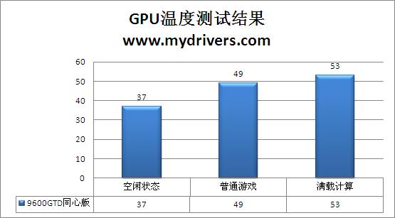 由于使用了G94的GPU,该卡的功耗也不可能会很大,同时带来的就是显卡温度不高这样的好处。通过图表我们可以很直观的看到,9600GTD同心版在待机状态下仅为37℃,基本与室外温度一样。而当我们进行3D游戏时,显卡较为稳定的将其温度控制在49℃,而此时的风扇转速为65%,以笔者亲身的主观感觉来看其噪音丝毫不明显。不过G94毕竟是较为中低端的产品芯片,就算开启FURMARK烤机,其满载计算时的核心温度也没有超过53℃,基本上与3D游戏时的温度近似,可见通过合适的设置可以让每款游戏都100%的利用到显卡的性能,丝毫不浪费玩家的每一分投资。