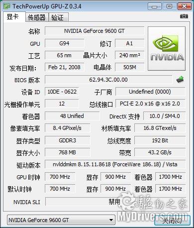 GPU使用的是NVIDIA的G94芯片,由于工艺的变革,该芯片现在已经成为了低功耗高性能的代表产品。从照片上我们可以看到其编号为“G94-209-B1”,其为55nm制程,厂商已经将其超频至700MHz,其流处理器个数为48个。由此可见,该卡并不是真正的9600GT,其真身其实为9600GSO,不过通过超频让其性能上与9600GT性能相当,然后厂家通过对BIOS的修改让操作系统将其识别为GT而不是GSO。