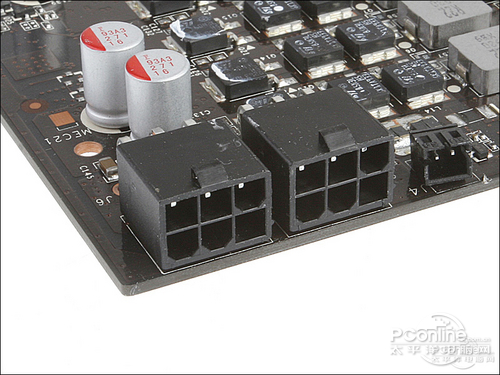 与市售GTX260+显卡一致,铭鑫视界风GTX260+ 896D3中国玩家版内置了两个6pin外接供电接口。而散热风扇的供电线试用了尼龙网包裹以保护电源线,算是人性化的设计。