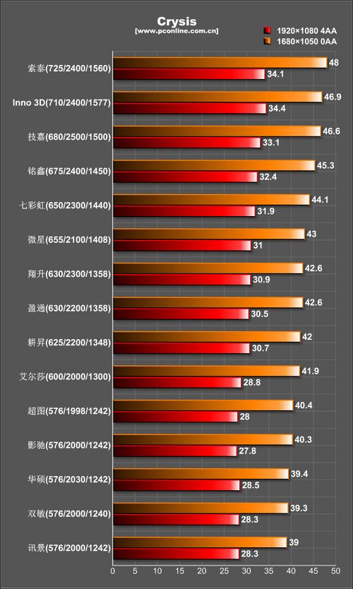即使是最高频的GTX 260显卡,在孤岛危机的测试中成绩帧数依然相比其余四项游戏测试低很多,这也印证了这个游戏依然“宝刀不老”,且由于普遍帧数较低,所以性能最大差距仅在9fps。