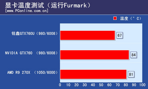 PConline显卡天梯图说明:虽说这款铭鑫GTX760U-中国玩家版显示核心频率、显存频率都保留了原来的默认频率980/6008MHz ,但是从数据这个事实面前可以看到,性能方面要比公版GTX760和AMD R9 270X都要高,所以处于上图的位置。