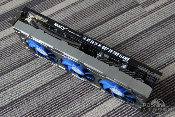 在顶部的位置还增加了一条非常有特色的加固条,并且用白色漆印上“游戏任你行”几个中文宣传标号,既可以加固保护加长后的PCB板防止变形,而且还可以突显此卡专为中国玩家而设计;其他细节中,供电则采用了6pin+8pin供电方式,保证了最大限度发挥出显卡最大性能,当然同时也配备了SIL交火接口,满足玩家对更高性能的追求。