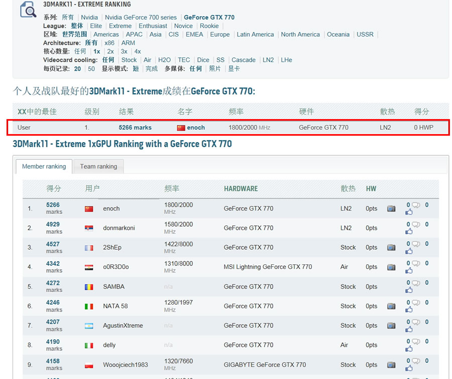 GTX770显卡虽然上市已经有一段时间了,但是凭借其强劲的性能依然担当着NVIDIA中高端主力显卡的重任。铭鑫视界风GTX770U-2GBD5中国玩家版便是众多GTX 770显卡中的佼佼者。国内著名超频玩家Enoch近日就将铭鑫GTX 770中国玩家版显卡超频至1800/8000MHz的恐怖频率,再次刷新GTX 770频率的世界纪录,并拿下3DMark11测试Extreme模式得分世界第一的好成绩。